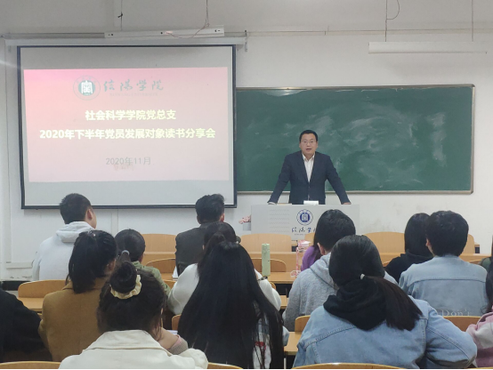 11月5日晚,社会科学学院党总支在社科楼301教室举行2020年下半年党员发展对象读书分享会。党总支副书记胡志国和2020年下半年党员发展对象共同参加了此次活动。