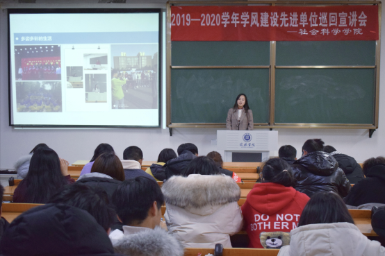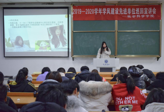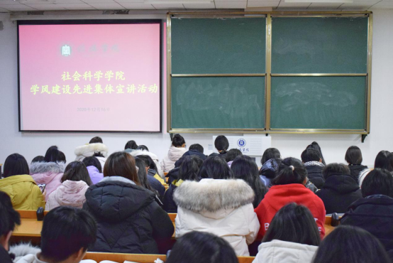 12月16日,社会科学学院在社科219教室开展2019—2020学年学风建设先进单位宣讲活动。社会科学学院20级新生部分班级代表共200余人参加了此次活动。