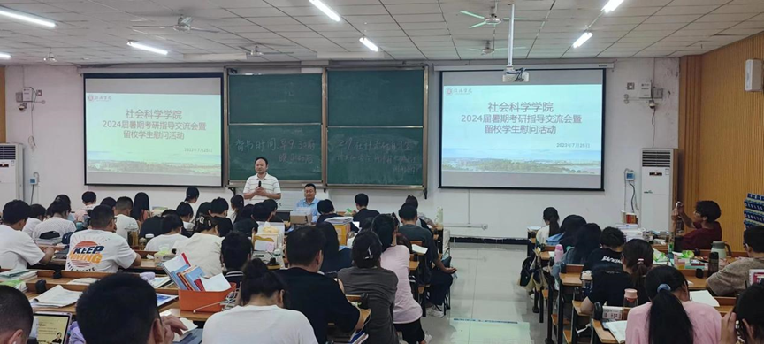 为进一步坚定考研学子信心、助力考研学子科学复习,并做好留校学生相关安全工作,社会科学学院于7月25日上午,在社科楼219教室组织开展2024届暑期留校考研学生座谈会暨慰问活动。学院党总支副书记胡志国,专业课教师梁耀中、陈杰,辅导员阚青、韩铁映和全体留校学生参加了此次活动。