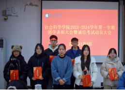 为进一步凝聚团学工作力量、总结工作经验、梳理工作思路、表彰优秀先进,2024年1月4日下午,社会科学学院在社科楼219教室召开2023-2024学年团学表彰、学风建设总结暨诚信考试动员大会。党总支副书记胡志国、学工负责人陈苗苗、团总支书记韩铁映、全体辅导员以及学生代表参加本次活动。本次活动由陈苗苗主持。