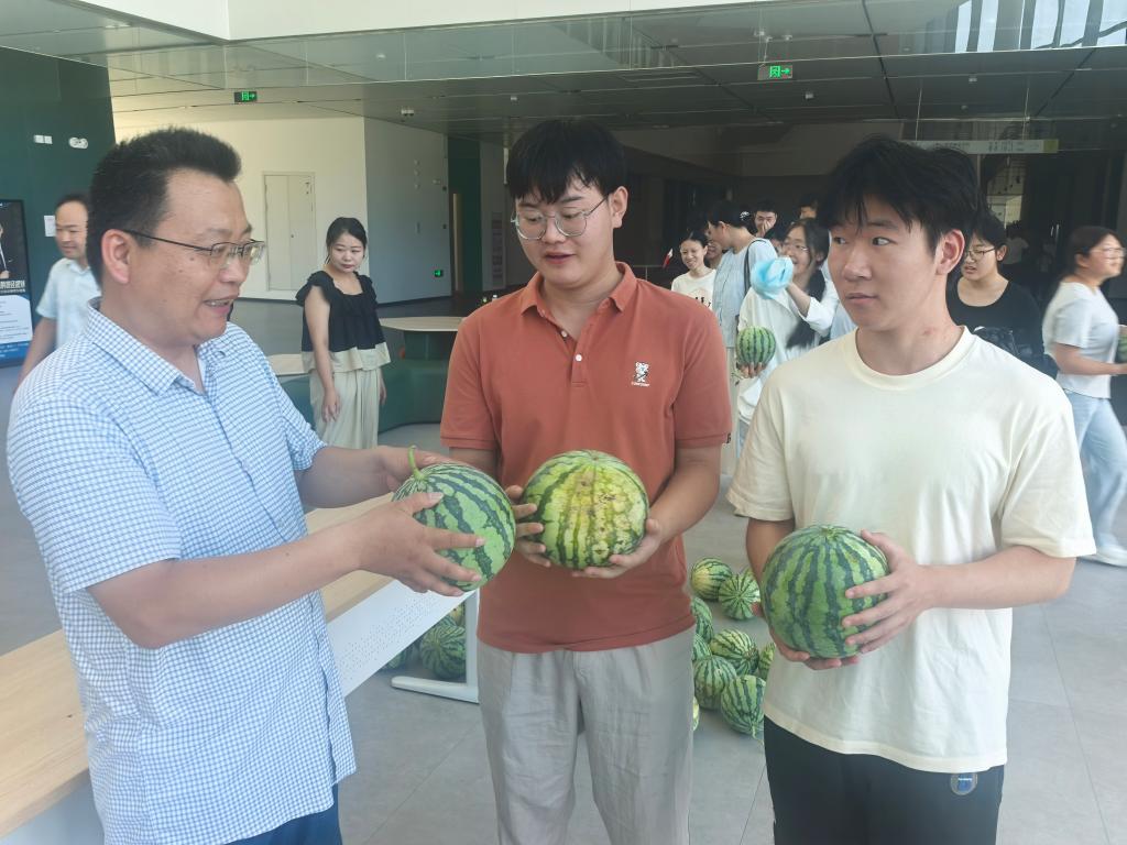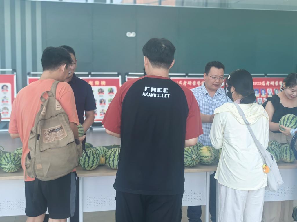 会后,各位老师代表学院将西瓜慰问品发放到同学们手中。