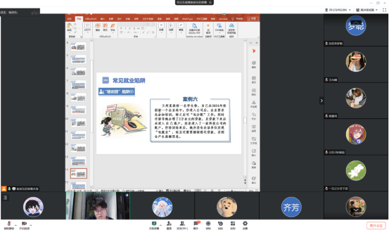 学校高度重视毕业生求职安全教育工作,学校招生就业处专门整理了常见的就业陷阱与诈骗案例,制作成常见就业陷阱PPT,并已提前下发至各毕业班辅导员工作群,为班会的有效开展提供了翔实素材。班会内容围绕识别虚假招聘、防范收费陷阱、警惕信息泄露、辨别传销组织、审慎签订合同等核心议题展开,引导学生树立正确的就业观、安全观,提升对招聘信息的鉴别能力和自我保护意识。