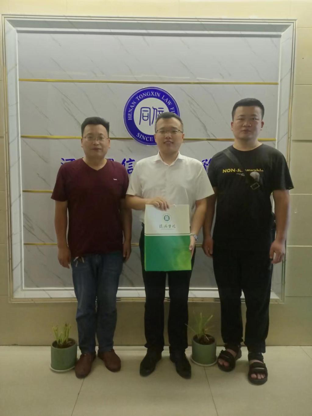 8月15日上午,党总支副书记胡志国带领法学专业教师胡晶、郝斌、何丽丽赴河南同信律师事务所开展访岗拓企专项行动暨走访校友活动,受到河南同信律师事务所执行主任吴宗玲和我校2007级法学专业优秀校友韩淼热情接待。
