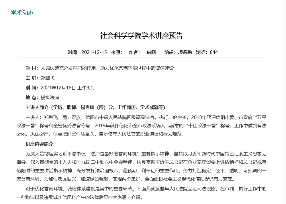 信阳市中级人民法院郑鹏飞法官一行来社会科学学院...